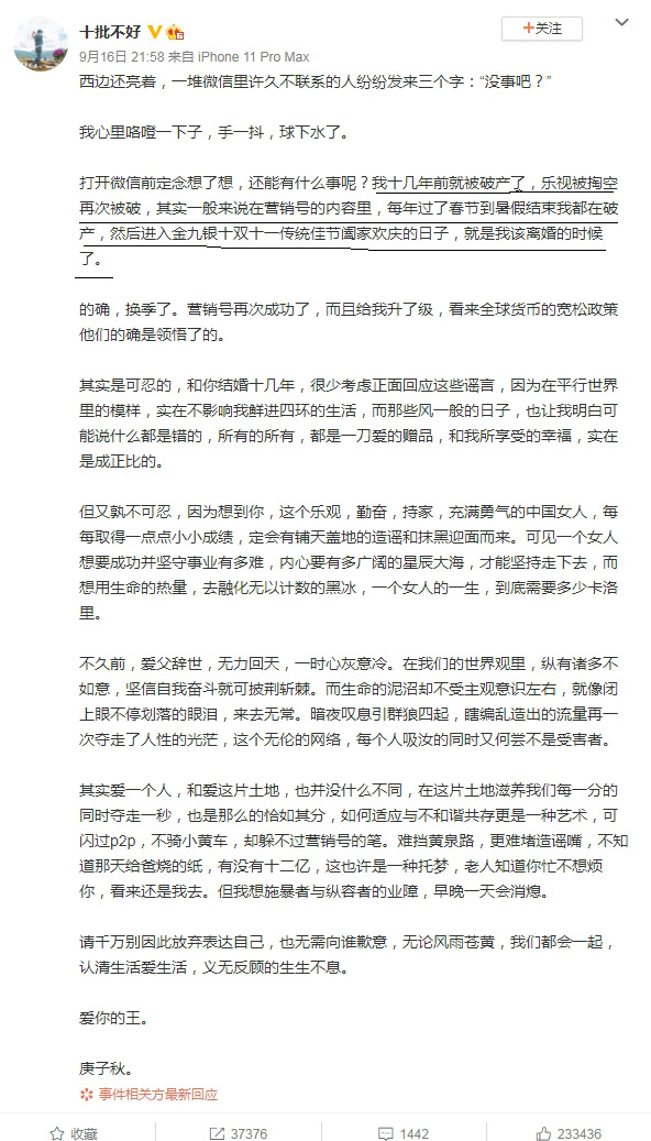 ![]() 什么会让刘涛感到无力??网友纷纷猜测,当然是还完巨大的债务后,再来一笔更大的,传言王珂这几年炒比特币欠下了高达12亿的债务,比前几年的债务更多,这才会让刘涛感到无力,不过对此刘涛很快就发布声明,并不是老公王珂欠下巨债,而是自己的父亲去世后比较伤感而写的这么一段话。 ![]() 王珂也对此进行了回应,表示自己十几年前就“被破产”,然后乐视倒了,自己再跟着被破产一次,其实这句回应背后的信息量还是蛮大的,“我十几年前就被破产了”,这句话是否意味着王珂其实从来就没有那么惨过,从来就没破产过,只是生意亏了,然后营销号将事件无限放大了。当年08/09年金融危机,王珂的生意遭遇重创,然后王珂此后有过一段时间身体欠佳,但是当时是否真的破产了,我们不得而知,王珂是做投资生意的,投资是金融行业,受整个国际大环境的影响很大。他父亲叫王恩来,是山东烟台莱州的,在当地非常有钱。 ![]() |