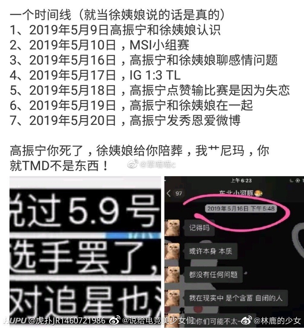 近日宁王的女朋友徐姨娘再次上了微博热搜,不过这个热搜全是骂她的,原因是她微信群里的一段聊天记录被网友截图放到了网上,在聊天中,她一直在抹黑IG的几位选手,然后极力的抬高自己的男友宁王,说:“没有高振宁的IG,恕我直言,真垃圾”;还说:“Rookie之所以不敢退役,是因为怕退役了没人气,留不住女朋友小钰”,这一种骚操作惹怒了网友。下面是徐姨娘的照片: