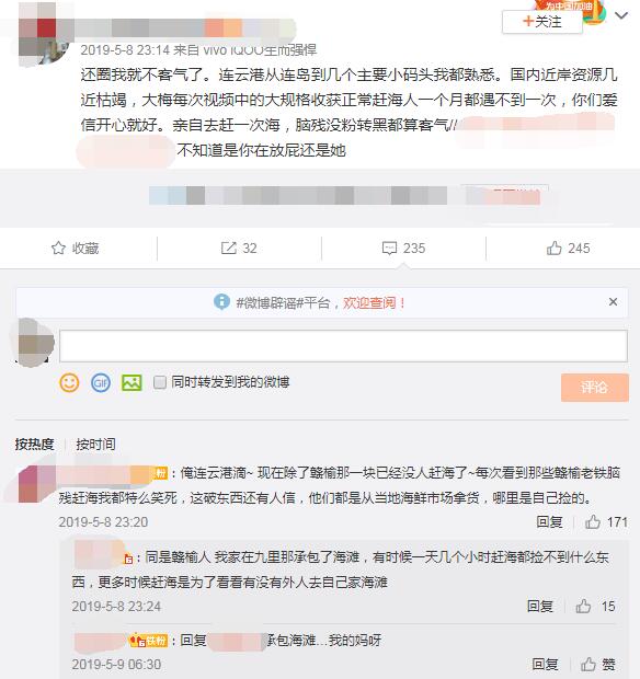 关于大梅的赶海视频,之前在微博上有个网络大V曾公开发文质疑过,认为连云港附近海岸赶海资源枯竭,很难像大梅那样每次都有不少收获,而下面评论中也有当地人证实这一说法,认为很多拍赶海视频的都是去买的海鲜,自己放自己捉。