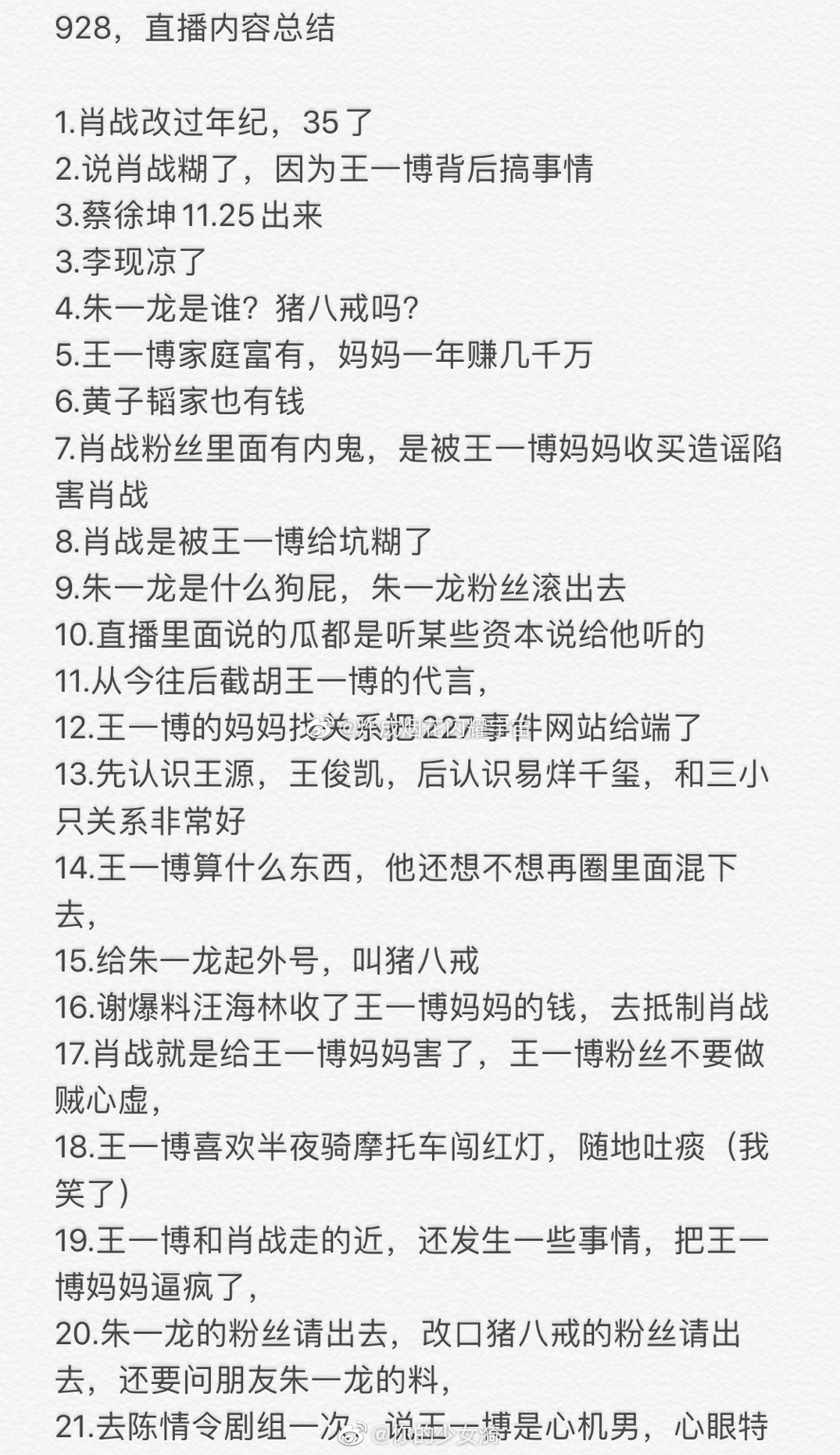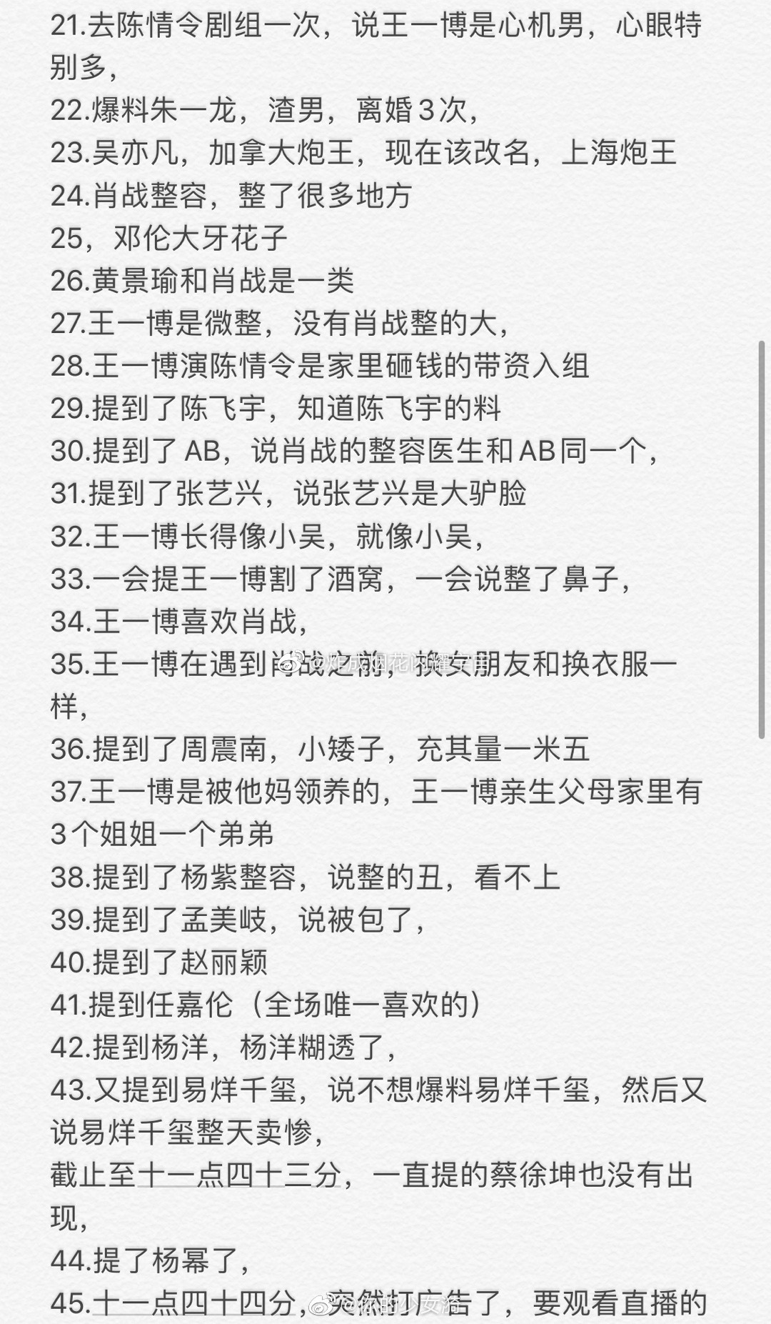 ![]() 谢明皓何许人也呢??据悉,他1998年9月8日出生于山东潍坊市昌邑市,高中时代就读于昌邑一中学音乐,2017年考入北京电影学院,算是一只脚进入了演艺圈,目前仍然在电影学院就读,通过在新媒体的运作,他目前在网络上有一定的知名度,同时也认识了很多圈里的大佬,根据他自己的说法,他爆料的这些瓜都是圈里的资本讲给他听的(闹半天也是听别人说的)。 下面是所有梗的汇总,大家看整个直播里面,被黑的最惨的就是王一博了,不知道王一博是真的这么黑,还是被黑?吃瓜就好,别太着急下结论。 ![]() ![]() ![]() |