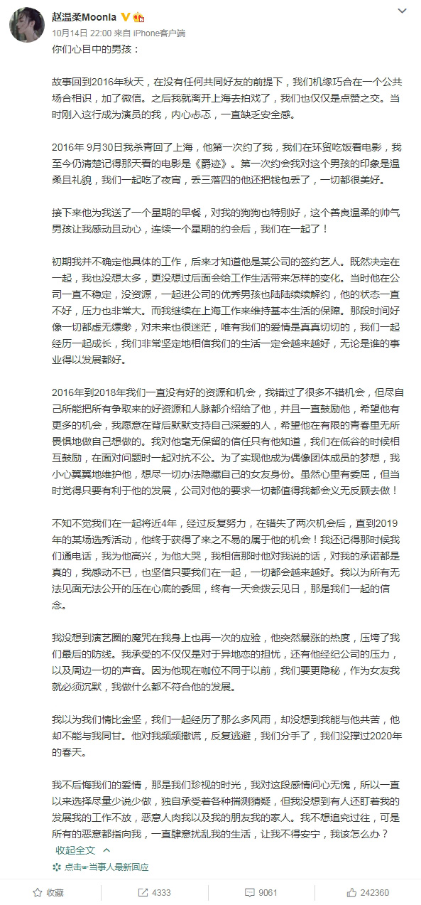最近任豪曝出一个大瓜,原来他从2016年开始便于赵温柔谈恋爱了,赵温柔在任豪最低谷的时候一路陪着他,在他没有资源的时候利用自身的关系给他争取资源,一步步的见证任豪的成长,结果在2020年任豪爆红后,任豪开始回避这段恋情,频繁的跟赵温柔撒谎,再加上公司的压力,两个人直接分手了,分手后,赵温柔写了一篇关于两个人的文章,题目是《你们心中的男孩》: