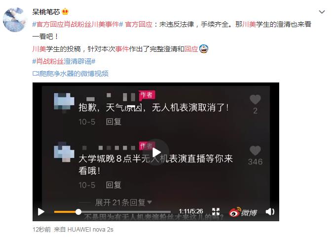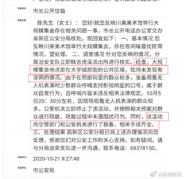 ![]() 但是因为天气原因,无人机表演被通知取消了,而10月5日当天刚好是肖战的生日(肖战出生于1991年10月05日),知道表演被取消的肖战粉丝们在现场组织了一个为肖战庆祝生日的小规模活动,整体活动也非常有秩序,大家唱生日歌,唱肖战的代表作,一切都很正常,节目结束后有一些粉丝还在现场参观了下涂鸦街、跟川美的大卫雕像合影了一下,于是一些肖战的黑粉丝造谣称:1、肖战的粉丝在川美现场乱涂鸦。2、肖战的粉丝爬上大卫的雕像(川美大卫雕像底座就高达1.88米,请问是怎么爬上去的??),于是被带起节奏来的肖战黑粉们一边倒的痛骂肖战,这就是“肖战川美事件”的来龙去脉。 ![]() 咱不管肖战粉丝以前是什么样子的,但是这次,纯粹是误解和带节奏,这不就在10月22日,官方给出明确答复了:“大规模集会地点未发现涂鸦情况;由于群众众多,观看表演时少数群众呼喊明星口号属于群众自发行为,未违反相关法律规定,无人机活动合法合规。” ![]() |