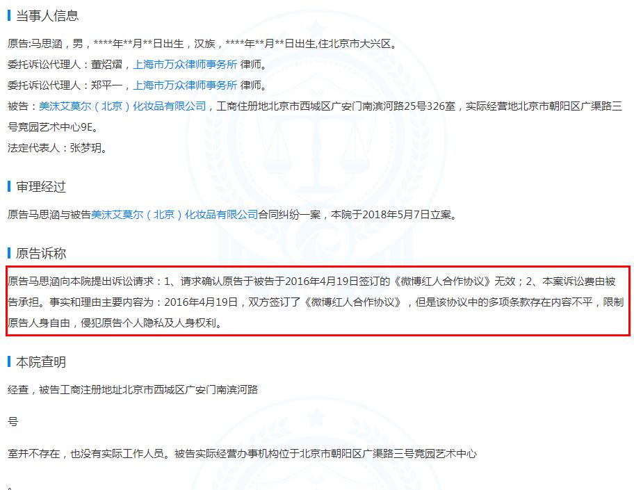 ![]() 网络上传言马思涵曾经跟张沫凡有过一段恋情后来分手,网友觉得这段恋情实际“目的不纯”,只是两个人为了商业目的在炒CP而已,实际上马思涵的女朋友另外有人,而且在一起长达7年。 ![]() 此外,马思涵还曾经告过美沫艾莫尔这个公司,是在2018年的时候,根据裁判文书网上的公开资料显示,马思涵告美沫艾莫尔这个公司的原因是:“2016年4月19日,双方签订了《微博红人合作协议》,但是该协议中的多项条款存在内容不平,限制原告人身自由,侵犯原告个人隐私及人身权利。” ![]() |