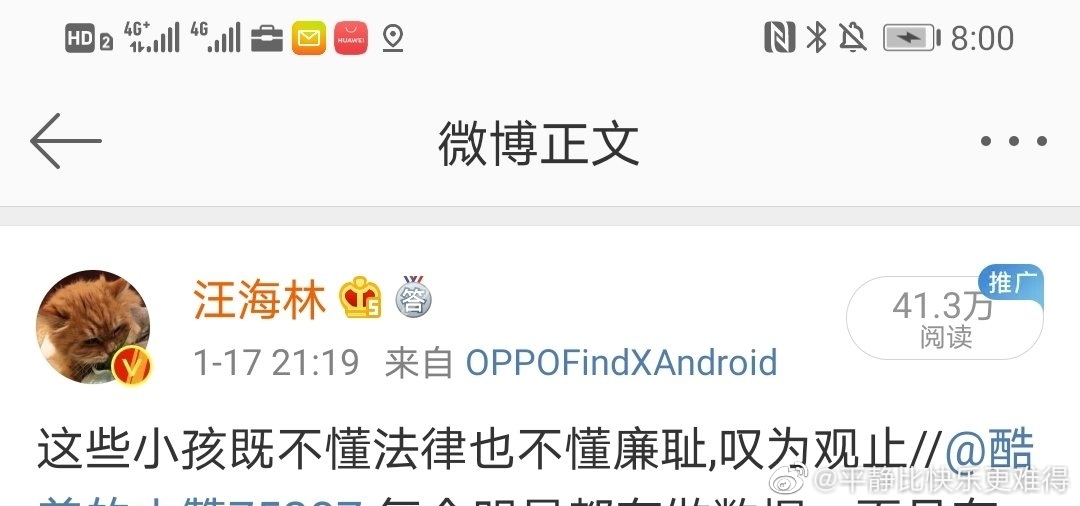 ![]() 对于汪海林的比较有段位的嘲笑,肖战的粉丝们也没闲着,翻出来了很多汪海林用词不当的一些语录,比如汪海林说:“这些小孩既不懂法律也不懂廉耻,叹为观止。”,肖战的粉丝就认为“叹为观止”用词不当。 ![]() ![]() |