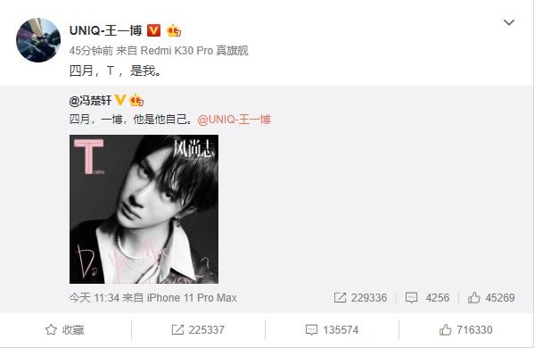 王一博四月t是我什么梗, 王一博四月t是我,这个首先出现在王一博的微博里面。王一博4月10日的时候,发出的一条微博,文字的内容就是四月,t,是我。这其实也是一条转发微博,前文是冯楚轩的微博,微博内容是王一博的杂志照片,这就一目了然啦,《Tmagazine》杂志,四月份杂志封面是王一博嘛,这个消息对于粉丝来说自然是要去围观的。 杂志内容也相当值的购买的,每一张都拍的非常好,帅就一个字,欣赏就完事了,王一博的每一个眼神,每一个动作,都透着冷峻让人心动的颜值,蓝忘机的感觉瞬间上身。 不愧是我王一博什么梗? 不愧是我王一博的梗是来源于拍摄《陪你到世界巅峰》的时候,王一博给剧组人员看了一个他骑摩托车的视频,还特意说上一句“It's me”,貌似是想表现一下自己车技好之类的,但是沙雕气质瞬间被粉丝捕捉到,于是给王一博配上了很多表情包,清一色的都是配上文字“不愧是我”,图片多了,自然就形成了一个梗了。 其实在看这些图片的时候,王一博的这种得意劲,自豪感是比较明显的,确实是有点小沙雕的,粉丝看了也是莫名好笑,于是表情包是越整越多,梗也越来越坐实了。 ![]() |