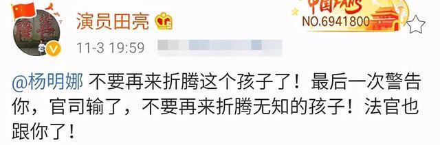 杨明娜是非常漂亮的一位女演员,1975年出生,今年已经45岁了,主要代表作有《那片星空那片海》(饰演苏桂芳)、《大唐荣耀》(饰演韩国夫人),在11月3日,杨明娜的老公田亮在微博上@杨明娜让其不要再来骚扰他们的儿子,通过微博来看,他们两个人已经离婚,儿子的抚养权判给了田亮,但是杨明娜不甘心,一直在骚扰他们。