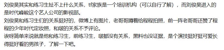 《青春有你3》出了选手名单了,其中刘俊昊赫然在目,那就要去关注一下了,之前好像还听说刘俊昊退出了时代峻峰了,是这样的吗?其实娱乐圈的竞争本来也很激烈,当初刘俊昊加入的时候,就引起了很大的轩波,之后又传说是退出了,总之一直话题争论声就挺大的,那么他当初是怎么进TF家族的? 刘俊昊退出时代峻峰了吗, 刘俊昊没有退出时代峻峰,就算是现在参加《青春有你3》背后的介绍公司也还是时代峻峰影视部,所以看起来他还是在时代峻峰的,并没有退出。 之前网上传的挺多的,那就有一个爆料,是微信截图,内容大概就是公司对刘俊昊安排貌似有些出处,于是刘俊昊疑似是要退出时代峻峰,但是后面看来似乎是很快就解决了,刘俊昊一直在时代峻峰待得挺好的,并没有什么其他传闻了,而且现在的发展也是越来越好。 他当初是怎么进TF家族的? 刘俊昊当初进入TF家族,据说还是背景雄厚的,有说是时代峻峰股东的儿子,所以一段时间黑料不断,而且他加入的时机,是在TF本来就有了一些成绩名气的时候,刘志宏离开的消息还没有消化完,这个时候对于空降的新成员刘俊昊,那是抵触的很,都将他作为蹭热度的人员来批评,而关于刘俊昊进入TF家族,很多网友都认为他就是凭着有关系来的。 事实上真不好说了,其实就刘俊昊后面的表现来说,还是可以的,不管是什么原因进来的,只要颜值高,实力到位,再加上性格好,努力进取,渐渐的都还是能攒到自己的粉丝的,所以现在的刘俊昊也是受到不少赞誉的,而TF家族也是越来越壮大了。
