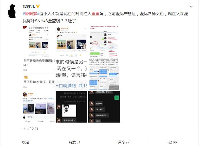 原图爹把截图用大号发布出来表达不满,甚至直接公布给其他女星发的私信,来暗指金莹玥玩不起。他的粉丝们也开始于他一唱一和讽刺甚至人身攻击金莹玥。