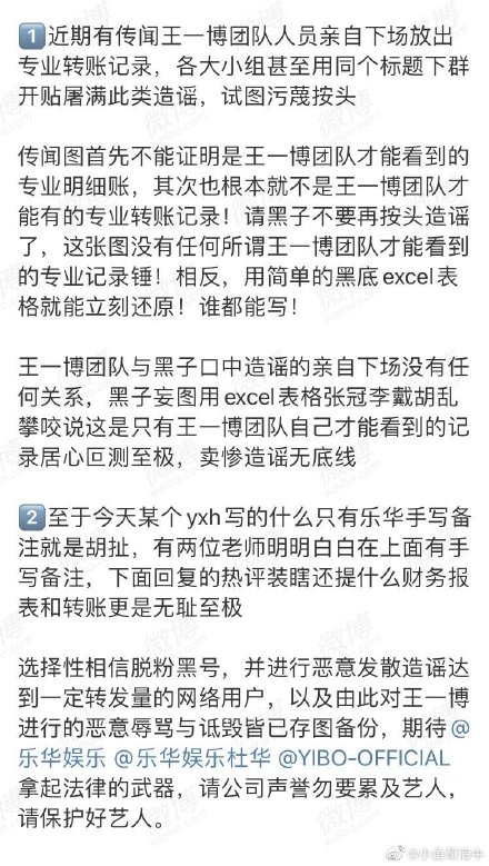 ![]() ![]() 不过对于这份银行流水,有懂EXCEL的网友表示,有了这个根本不能说明问题,认为略懂EXCEL的人分分钟都可以伪造这样一份转账记录,根本无法凭借这样一份“真伪不明”的转账记录就可以判断王富贵是王一博内部的工作人员,所以现在说王一博黑肖战实锤了还为时尚早。 ![]() 除了王富贵登上热搜,肖战的经纪人张晶也登上热搜,有网友称,早年存在的一些炒作肖战的同人文实际都是出自张晶之手,对此张晶表示:“我姓张单名晶,可能有几十万人跟我重名。英文名Melody,大中国应该也有几十万。”网络上的各种铺天盖地的消息都是造谣,已经达到立案标准,并称自己保留起诉的权利。 ![]() 有一部分理智的网友认为说张晶写这样的同人文确实有点不太可信,毕竟作为经纪人张晶很忙。 ![]() |