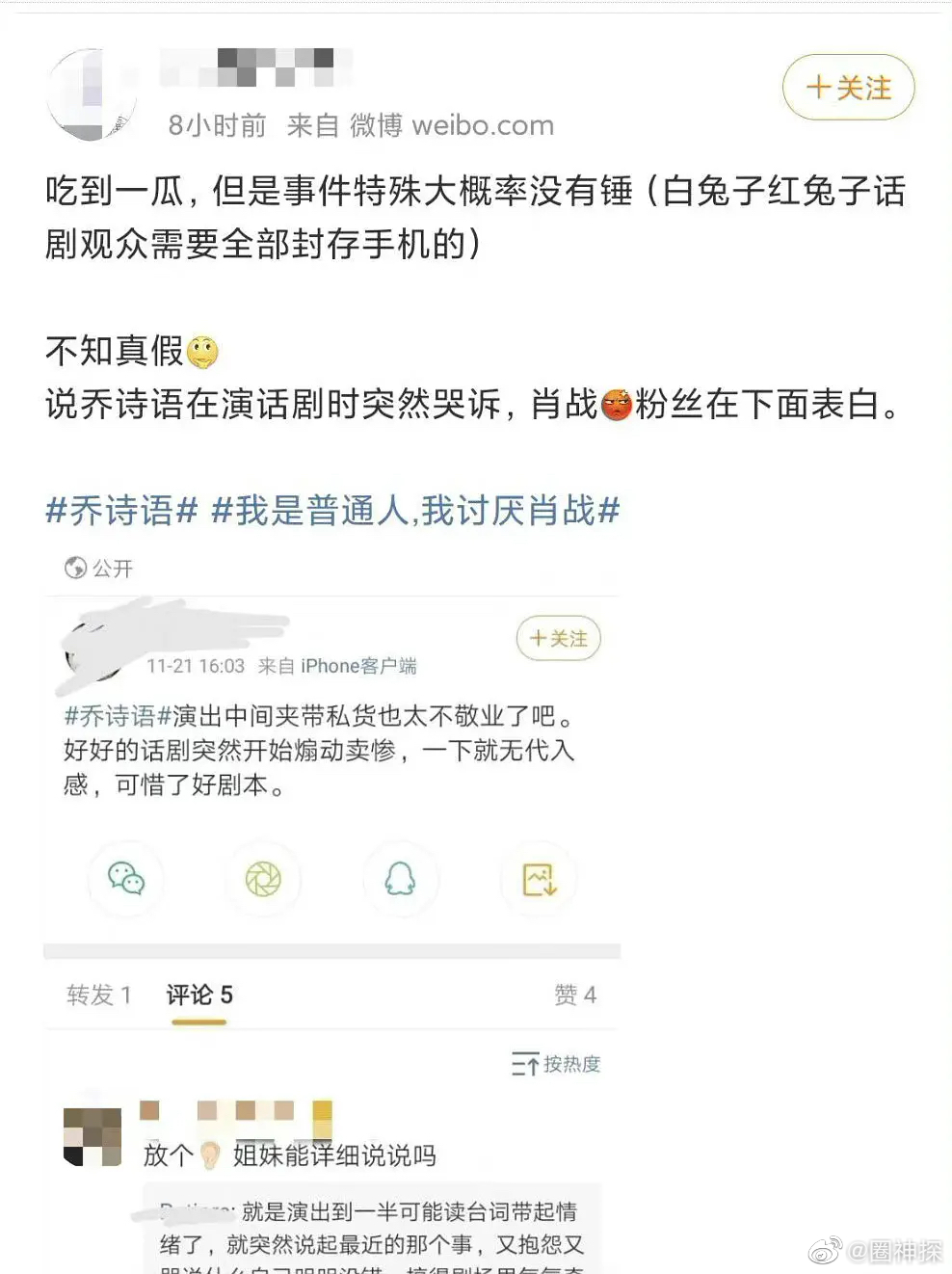 ![]() 首先让我们来看看乔诗语转发肖战微博的事件: 在今年肖战过生日的时候,乔诗语转发微博为其庆生,因为乔诗语是给闪耀暖暖配音过的,大家都知道现在娱乐圈跟肖战扯上关系,往往会被骂的很惨,乔诗语的这个转发微博的行为,让闪耀暖暖的玩家很不满意,官方也换掉了乔诗语的配音。 ![]() 然后,乔诗语一冲动,怒怼粉丝 ![]() 然后在这个事件发生之后,乔诗语表演话剧《白兔子·黑兔子》,在表演的过程中突然哭诉,还被肖战的粉丝表白,这让网友批她不专业,夹带私货,整体的事件大约就是这个样子的。 ![]() |