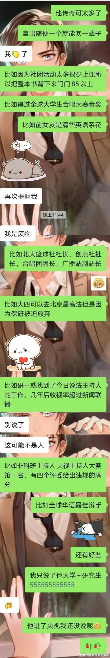这两天撒贝宁总是上热搜,先是被封为“凡尔撒”,然后他的整个学生生涯的传奇经历被扒出来之后,网友又给他封了一个新的人设头衔“晋江男主”,那么不少人会问晋江男主人设是什么意思??先别急,咱们先看看撒贝宁的传奇经历吧!首先撒贝宁的记忆能力超好,用他的话说就是“照相机”一般的记忆,我们是背重点,撒贝宁是一整本书直接背下来,经常不去上课,老师都不认识,但是一考试成绩顶呱呱,会打篮球、会唱歌、上大学还找了清华英语系的系花做女朋友,不但北大本科是保送的,北大研究生也是保送的,要不是保送了研究生,撒贝宁就要去北京最高法工作了,总之撒贝宁的每一个经历拿出来都是传奇,完全符合晋江校园男主的人设!