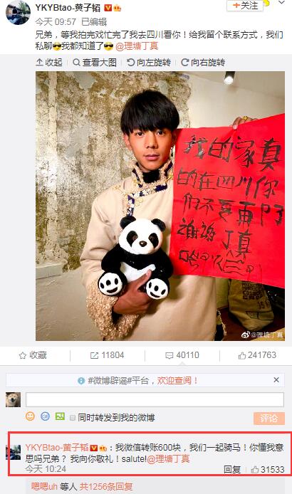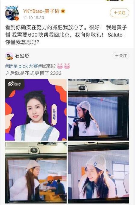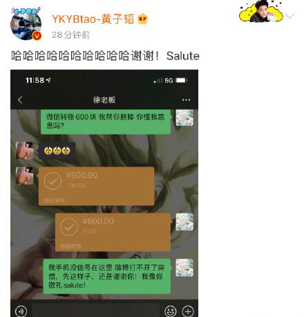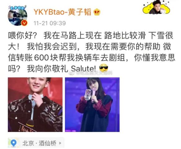 在与石玺彤互动转发时也用到了“我是黄子韬 我需要600块帮我回北京,我向你敬礼! Salute !你懂我意思吗?”