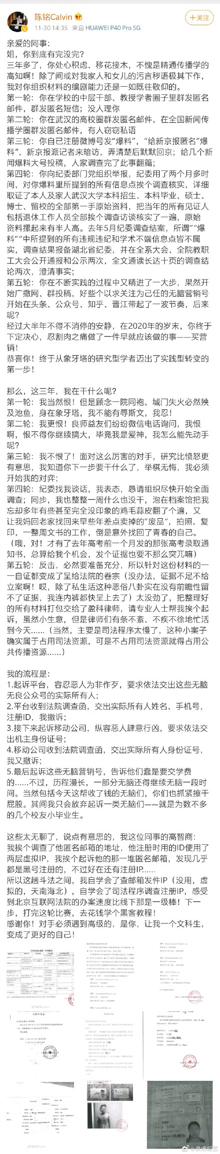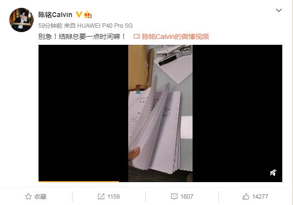 在11月30日中午的时候,陈铭也在微博晒出湖北省武汉市武昌区人民法院受理案件通知书及裁定书,称“别急!结辩总要一点时间嘛!”