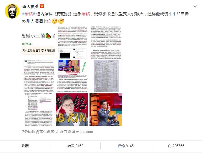 近日,奇葩说选手陈铭疑似学术造假,拆散别人婚姻上位,登上微博热搜,引发广大网友的热议。