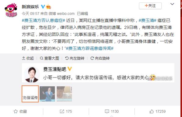 经过记者到费玉清团队求证“此事系造谣,纯属无稽之谈”。小哥身体很健康。