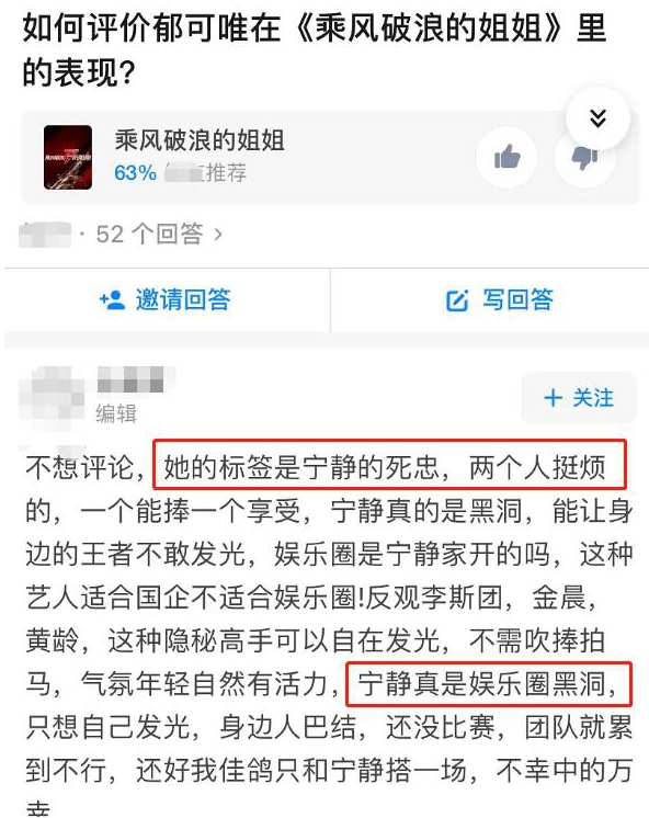 今年最火的一档综艺节目,绝对非《乘风破浪的姐姐》莫属,虽然这档综艺有些高开低走,但不可否认的是,这档节目为各大营销号提供了无数素材,也让参加这档节目的姐姐们红的发紫、紫的发黑。说句不好听的话,万茜如果没有参加这档节目,依然是那个演技绝佳的姬圈甜菜,而不是负面缠身的“万皇”。 《乘风破浪的姐姐》这档节目中的女艺人轮番上热搜,不管是遭到淘汰的还是后来留下的,都留下了自己来过的痕迹,不过可惜的是,她们上的大都是负面热搜,最后就连一直备受好评的万茜,也变成了节目力捧的“皇族”,因此引来了无数黑子,尤其是成团夜之后,宁静和其他成员之间的僵硬关系更是被摆在了明面上,从正面印证了“成团即解散”这句话。 万茜点赞的关于宁静的黑评 而万茜点赞宁静黑评的热搜,也把万茜推到了风头浪尖,据说万茜点赞了说宁静架子大,说宁静拖后腿之类的,其实这个是知乎上的,但是被人搬运到了微博,然后舆论逐渐发酵,让万茜和宁静的不和被摆在了明面上,那么后来这件事是怎么解决的? 不知道是万茜的经纪公司公关不给力,还是有预谋的搞万茜,反正就算万茜称自己知乎被盗号了,但依然有不少人表示不相信,觉得万茜又当又立,全网一片骂声,也许是因为放弃了公共,也许是默认了传闻,反正后来这件事再也没有人回应过,不管是万茜还是宁静,都当做这件事没发生过,两人还一起录制了节目《姐姐的爱乐之程》,节目中说说笑笑,似乎没有一点隔阂,这件事情就此告一段落。