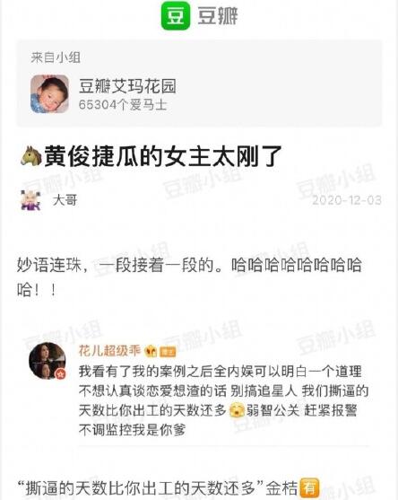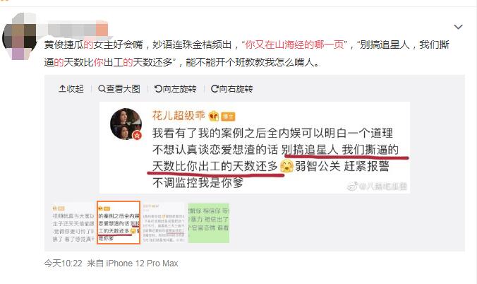近日,黄俊捷因为公开恋情,被一位叫“花儿超级乖”的女网友揪出来吊打渣男登上微博热搜,女生爆出大量聊天记录和音频直指男方劈腿,而男方的团队与粉丝也对女生发起攻击,女生自称追星女孩,每天撕逼时间比他们工作时间都多,以完美口才,不带脏字的回击攻击者。