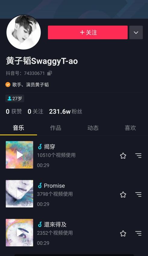 他在抖音平台也有自己的账号,抖音号:74330671 这里只有一些音乐作品,不更新其他短视频.