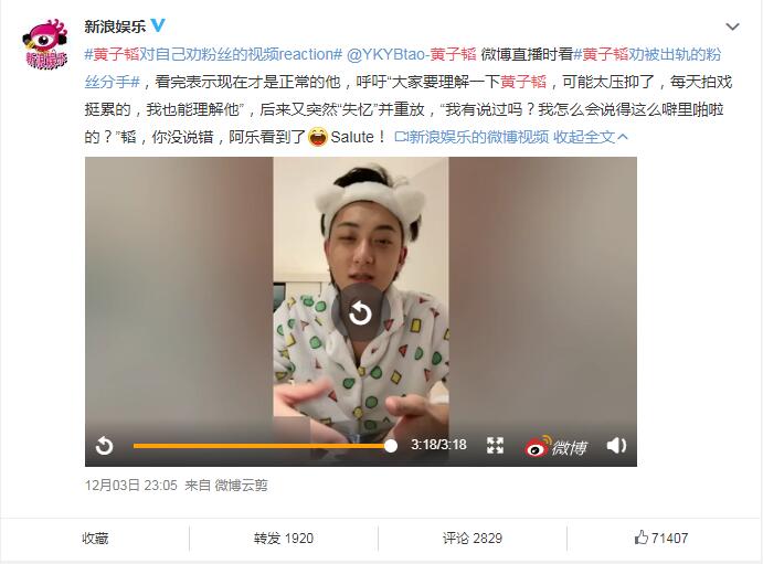 日前,黄子韬在直播时,用吼的方式劝被男友出轨的粉丝分手,因为言辞有些激动,粉丝在下面评价说:黄子韬虽然疯了点,但三观正,但黄子韬事后回看视频称,当时不是正常状态的黄子韬,因为每天拍戏很累,太压抑了,导致说得这么噼里啪啦的,那有喜欢黄子韬的粉丝要问了,在哪个平台才能看到黄子韬的直播?和喜欢的爱豆互动呢?