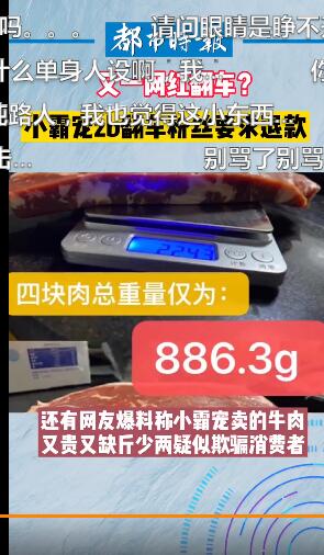 有粉丝拍摄视频晒在小霸宠小店里买的牛排,总重宣传的是1000g,结果收到称重只有886.3g,2斤的肉少了2两半,疑似联系客服也没得到满意答复,因此联系大V把此事发到微博上进行发酵。