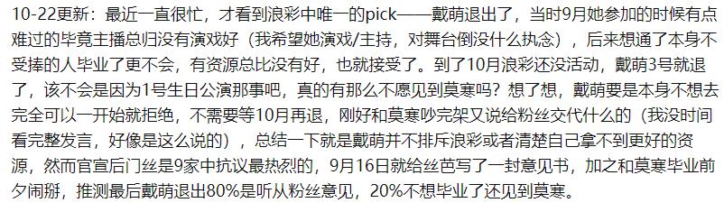 十月份从SNH48毕业出来的戴萌,已经是一个独立的艺人在发展着了,大家对她的期待也是满满的,毕竟人美歌好,还气质甜呢。而加入的浪彩少女也引起了很大关注度,只是最近网上传了好多,说是戴萌被浪彩少女官博取关了,看起来是退出浪彩少女了,这是为什么,另外戴萌许佳琪迪士尼事件怎么回事? 戴萌为什么退出浪彩少女 戴萌退出浪彩少女这个事情在网上掀起的波浪还是挺大的,一开始大家也是根据浪彩官方微博取关了戴萌,还有抖音号上面发布的节目祝福视频没有带上戴萌,猜测戴萌是不是已经退出了浪彩少女了,而后面浪彩少女的一系列举动都没有戴萌的加入,大家才想到,戴萌这个应该是没有签合同就早退了。 戴萌退出浪彩少女的原因,她自己没有讲,就不得而知了,但是从粉丝们的分析中可以得出,戴萌退出浪彩少女应该是一件利弊相应的事情,戴萌是非常有退出浪彩少女的理由的,主要原因在于年纪不小了,不应该花费时间在其他的事情上,她应该专注的做自己喜欢的事情,当然了很多网友觉得她是听取了粉丝的意见,大批量的粉丝都在建议戴萌退出浪彩少女。因为虽然浪彩少女这个资源应该是挺赚钱的,但是大家并不看好这个电商女团。 戴萌许佳琪迪士尼事件怎么回事? 戴萌和徐佳琪迪士尼事件,就是戴萌和徐佳琪在迪士尼玩乐的时候,被粉丝认出来了,于是要求合影,而戴萌和徐佳琪同意了,但是她们当时的女团SNH48有明确规定,不可以和粉丝私下来往,合影也是不行的,于是两人被处罚了,其实就是一个小事情,但是两人背后的粉丝团可是不小的,这事件曝光到网上之后,引起了不小的争议,针对这事件,粉丝们热烈的谴责了一番戴萌和徐佳琪背后的公司。