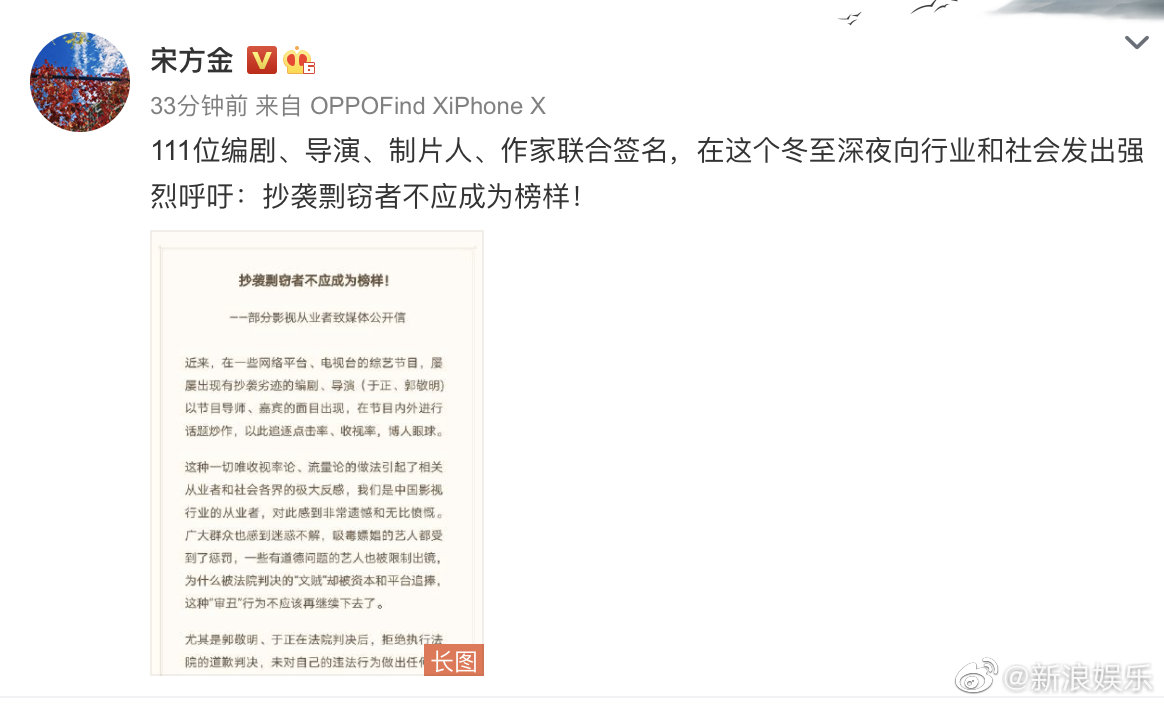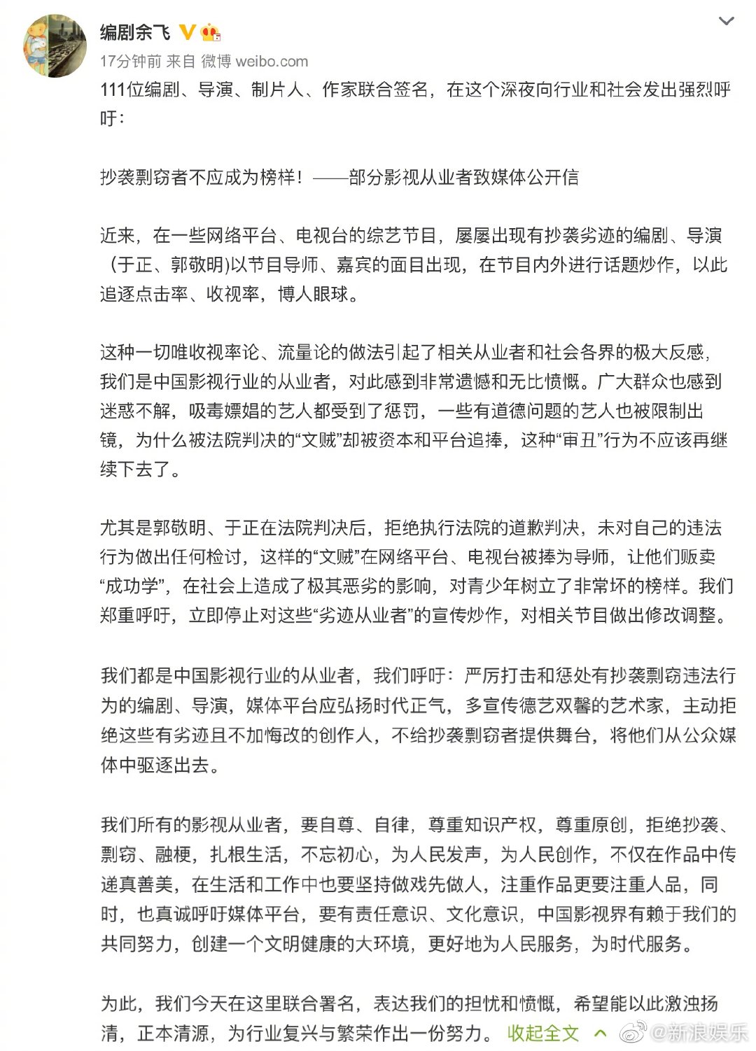 2020年12月21日晚,111位编剧、导演、制片人、作家的联名信抵制抄袭、剽窃者,在联名信中直指有抄袭劣迹的郭敬明、于正出现在综艺中进行话题炒作,应停止对他们的炒作宣传,呼吁不给抄袭剽窃者提供舞台,多宣传德艺双馨的艺术家,尊重原创。联合署名的包括余飞、宋方金、琼瑶、高群书、白一骢、董润年等,歌手杨培安也转发相关话题表示支持。