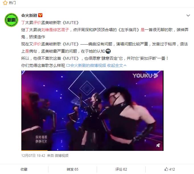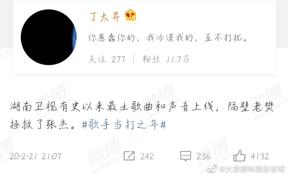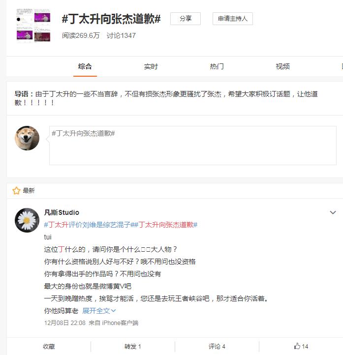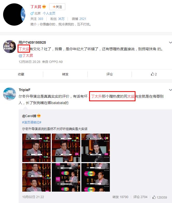 ![]() 对于丁太昇的评价,小编不做过多的评论,但是小编感觉丁太昇是“蹭流量”的高手,谁有了热门事件,他总是来蹭上一把,尽管自己的评价可能面临巨大的争议,他都不管,比如前段时间刘维凭借综艺节目火遍全国,他说人家刘维是“综艺混子”;还有萨顶顶的《左手指月》火遍全抖音的时候,他说这首歌很无聊等等。 ![]() 在今年的2月份,他还DISS过张杰,说“湖南卫视有史以来最土的歌曲和声音上线”,下面是当时的微博截图,对此,微博上还成立了一个话题小组,要求丁太昇向张杰道歉。 ![]() 下面是网友成立的话题组,要求丁太昇道歉,最后也不了了之。 ![]() 另外因为怼天怼地,惹得不少爱豆的粉丝不满意,粉丝们喜欢骂丁太昇是“大太监”“死太监”等等,下面是微博上粉丝骂他太监的截图。 ![]() |