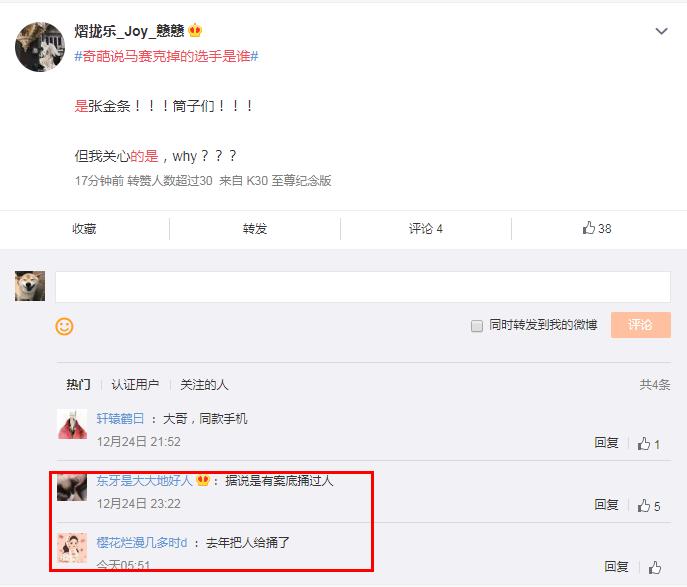 ![]() 发现这位被打码的选手后,很多人进行了猜测,有人觉得是徐真真,还有人认为是杨奇函、李大锤、邱晨等等,不过都是错的,目前基本确定改名被打码的人是张金条!颜如晶的一个镜头他出镜的位置来看,正是被打码的地方!观众席第一排左边数第三个人,正是张金条! ![]() 那么为什么张金条被打码呢??微博上有人给出了解释,当然这个解释不知道对不对,都是网传的。 ![]() |