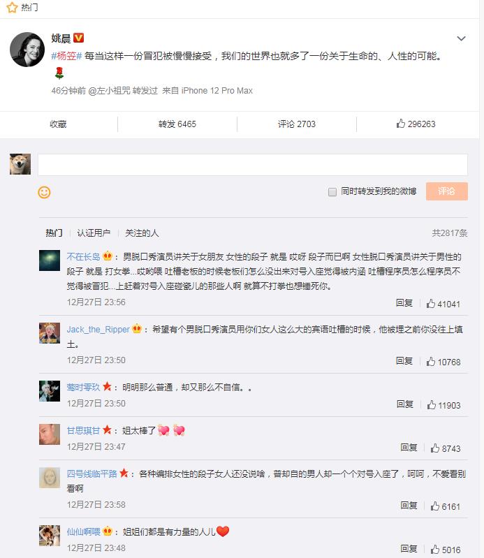 ![]() 杨笠在节目上有人认为自己是讨好女观众,其实并没有,自己一直想办法讨好男观众,结果没想到“讨坏了”,于是有男网友去微博上骂他,认为她是这个世界上最可恶的老巫婆,杨笠则回怼“你为什么看起来如此普通,却如此自信”,然后男粉丝因为这句话更不乐意了,对此杨笠又开始爆梗时刻,她说:我说你是“垃圾”你肯定不乐意,说你是“好人”你又觉得我是在骂你,现在说你是“普通人”,你还不乐意,那你到底是什么人啊?见仁(贱人)见智的事。 ![]() 就因为这个梗,到底她被举报,认为她歧视男性。目前在互联网上喷子确实有点多,杨笠完全没必要通过这样爆梗来进行回应,虽然确实很有趣,但是肯定会伤一部分人的心,把自己推上风口浪尖。对于杨笠的遭遇,姚晨还出来为其站台,不过也被骂惨了! ![]() |