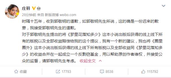 大家都知道前段时间娱乐圈有一个重大的事件,就是多达100多位导演、编剧联合签名抵制于正和郭敬明,原因是两个人涉嫌抄袭,希望他们两给被抄袭方道歉。今天郭敬明终于鼓起勇气道歉了,十五年前郭敬明的《梦里花落知多少》被指抄袭庄羽的《圈里圈外》,并被告上法庭,当时法庭就判了郭敬明抄袭了,郭敬明赔了钱,但是没道歉,这件事让很多人耿耿于怀,也就有了100多位导演编剧抵制他的事。对于郭敬明的道歉,庄羽欣然接受,并决定将《圈里圈外》的版权费和《梦里花多知多少》的版权费一起成立一个“反剽窃基金”吗,如真能成行,那这可真是天大的好事了!