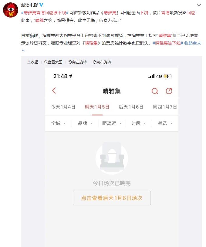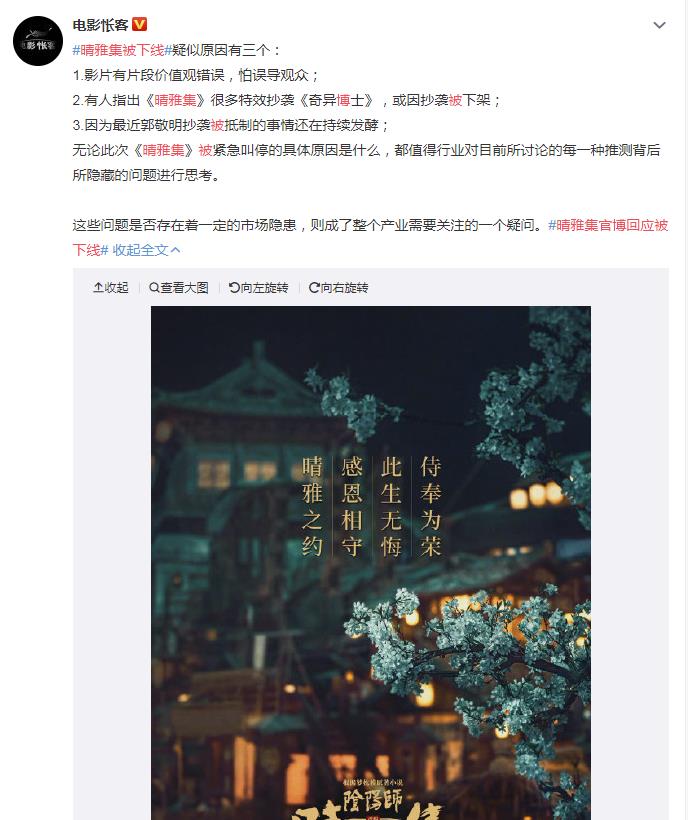 《晴雅集》是最近话题比较多的一部电影,是郭敬明导演的一部作品,该剧2019年8月19日开机拍摄,讲述了阴阳师晴明(赵又廷饰)遵循师傅的遗愿,去东方主城消灭封印在皇后体内巨蛇的故事,在途中晴明跟士博雅、法师泷夜相识,并一起探索隐藏的秘密的全过程,看过该剧的小伙伴表示拍的不错,目前该影片已经上映十天,票房4.5亿。不过就在今日,晴雅集被要求下线,目前该片在猫眼、淘票票两大购票平台上已经搜索不到排场了。 |