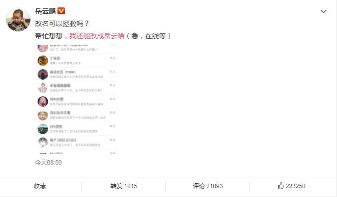 岳云鹏微博发文称:“改名可以拯救吗?帮忙想想,我还能改成岳云啥(急,在线等)”