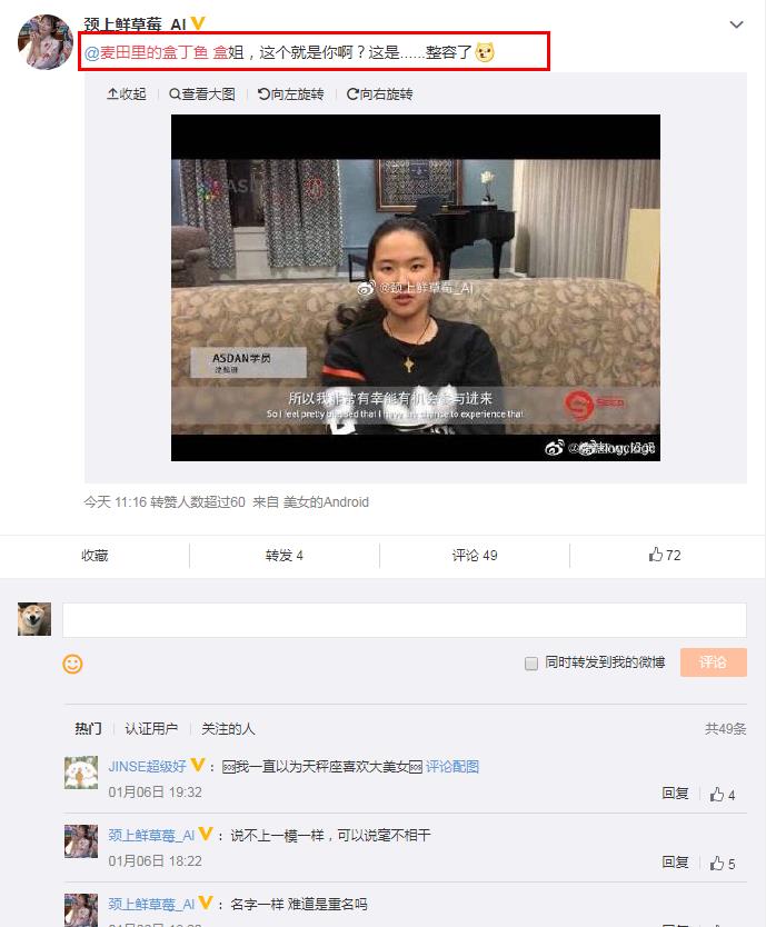 小盒鱼会喵喵微博原名是“小盒鱼会喵喵叫吗”,她是焉栩嘉的前女朋友,当时有网友曝出她跟焉栩嘉亲密的照片坐实了两个人的关系,不过后来分手,下面是当时她跟焉栩嘉的亲密合照: