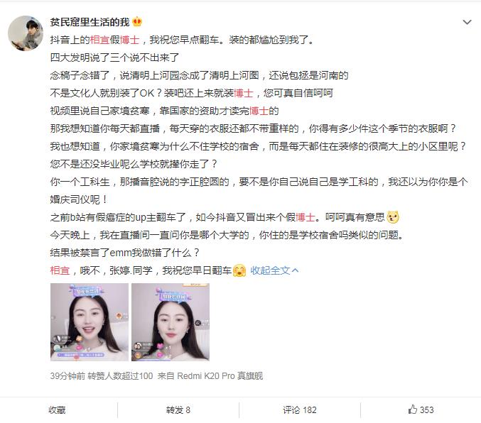 有认识她的网友说,她是真的博士,原名叫张婷,1990年出生,是西安建筑科技大学的博士,曾经她在爱奇艺上面有过一个《弟子规》的付费视频,上面有她的介绍,大家可以爱奇艺上搜索“相宜弟子规”找找看。 ![]() 下面则是网友对其学历和能力质疑的一些点,所以有网友认为就算是真的博士,也是挺水的。 ![]() |