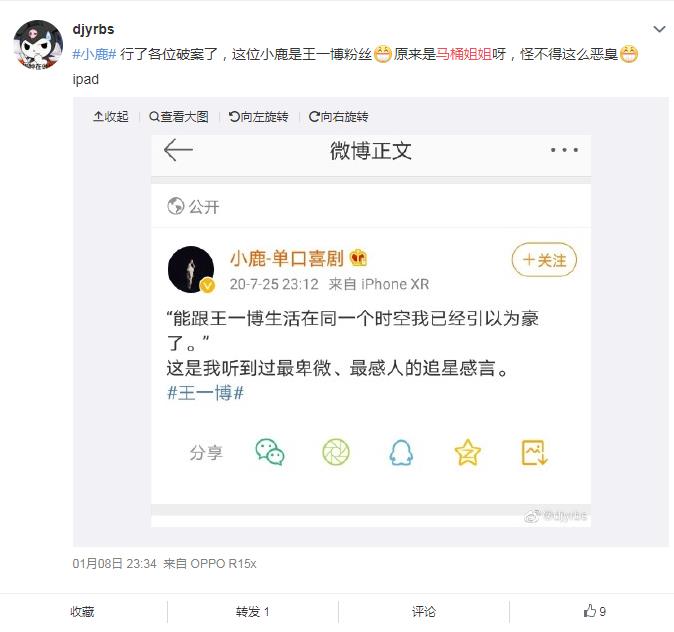 最近一期的《奇葩说》让单立人喜剧的演员小鹿一夜爆红,不过随后有肖战的粉丝分享了一段小鹿不太好的脱口秀段子,大意是说“好不容易把孩子养大了,你也不知道他会长成什么人,可能是杀人犯、恋童癖,还可能是肖战的粉丝”,对于这个锅,不少肖战的粉丝表示自己好好的学习工作,突然就被扣上一个帽子,竟然跟杀人犯和恋童癖“相提并论”了,还有网友找到一些小鹿的微博后发现原来她是“马桶姐姐”,也怪不得喜欢骂人了。 |