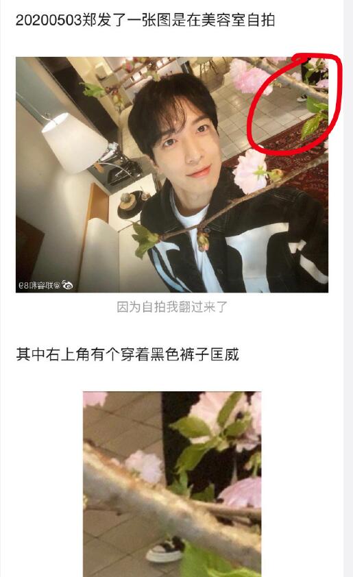 但有姐妹发现一个有趣的巧合,2020年5月3日郑容和发了一张在美容室的自拍,在照片隐秘处出现了黑裤子匡威板鞋。