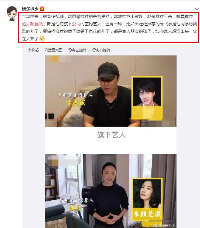 ![]() 朱颜曼滋是姚晨旗下的艺人,姚晨的公司叫:坏兔子(上海)影业有限公司,对于朱颜曼滋姚晨是非常看好的,在2020年的金鸡电影节上,姚晨还力推朱颜曼滋。 ![]() 在2019年之前的介绍里,我们看大家都说朱颜曼滋是中国话剧院的演员,只是不知道在签约了姚晨的公司之后,还可以不可以继续在话剧院工作。 ![]() |