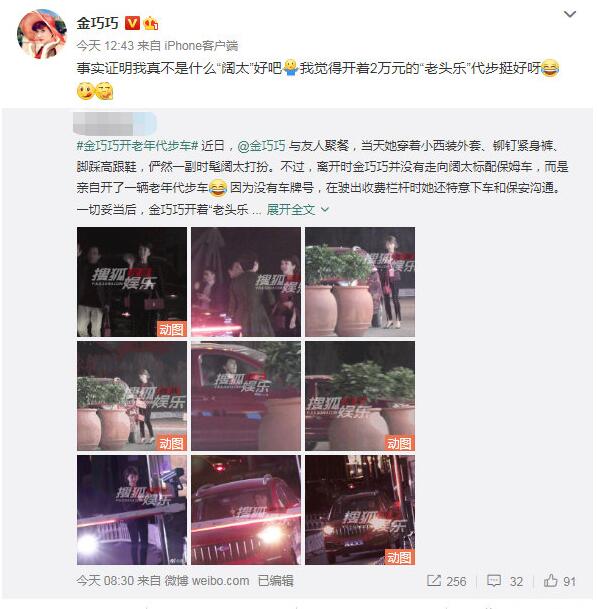 近日,有人拍到金巧巧和朋友聚餐后,开着一辆老年代步车离开,随后,金巧巧转发此博文,并称此车为价值2万的“老头乐”,自己并不是什么阔太。