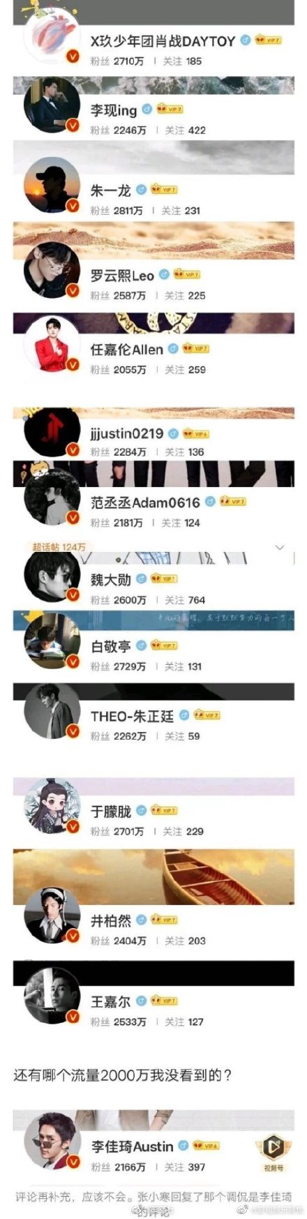 1月27日有网友传言一微博粉丝2000多万的爱豆疑似塌房,称该名爱豆有多年交往的圈外女友,该消息在豆瓣、抖音、微博等多个平台迅速传播,很快网友扒出来14名微博粉丝超过2000万的爱豆名单如下: