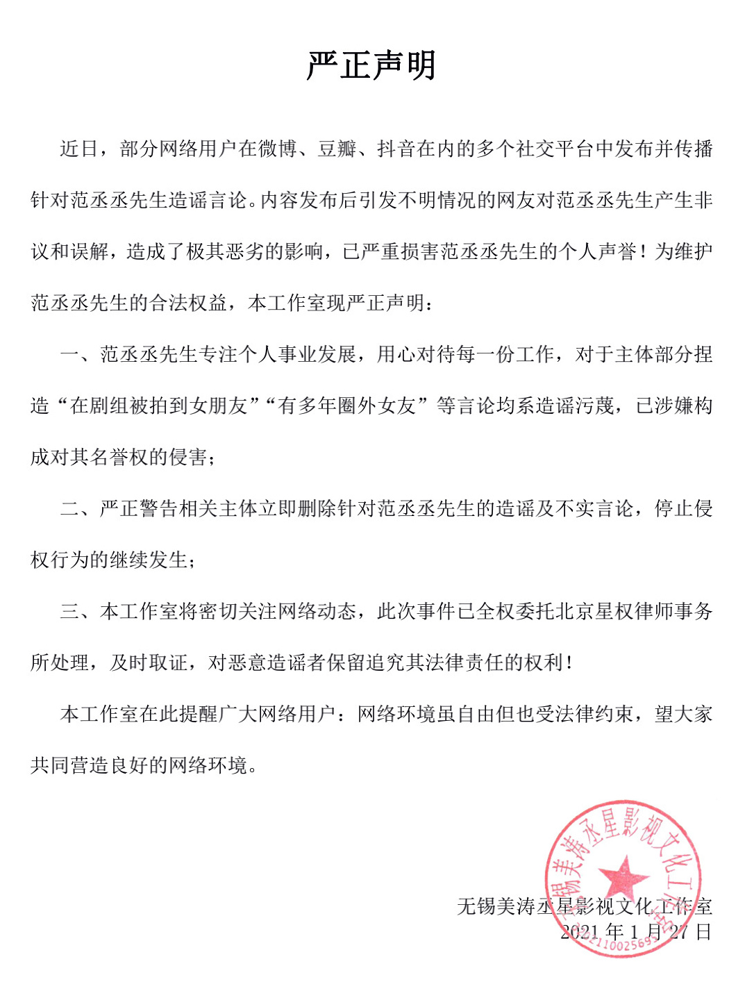 ![]() 在经过多方的汇总之后,有网友指出这名塌房的爱豆极有可能是范丞丞,对于这个消息,范丞丞的公司“无锡美涛丞星影视文化工作室”在1月27日迅速发布《严正声明》,称在剧组拍摄到范丞丞女友,以及范丞丞拥有多年的圈外女友一事为不实传闻,对范丞丞的名誉造成影响! ![]() |