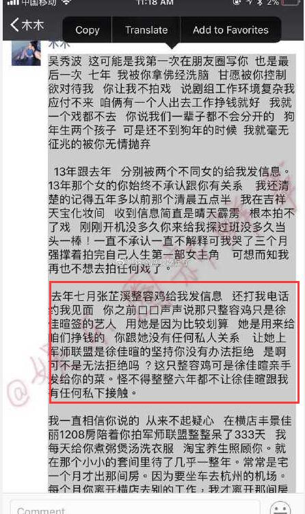 在2018年中秋节一位自称跟了吴秀波7年的女生陈昱霖发长文称,自己被吴秀波长期洗脑玩弄感情,并直接实名DISS张芷溪是小四,并称对方为整容鸡,说2017年的时候张芷溪曾给自己发信息约见面多次挑衅,导致自己抑郁。
