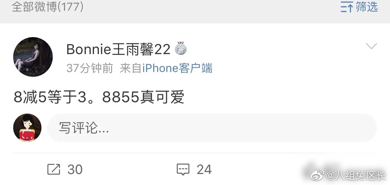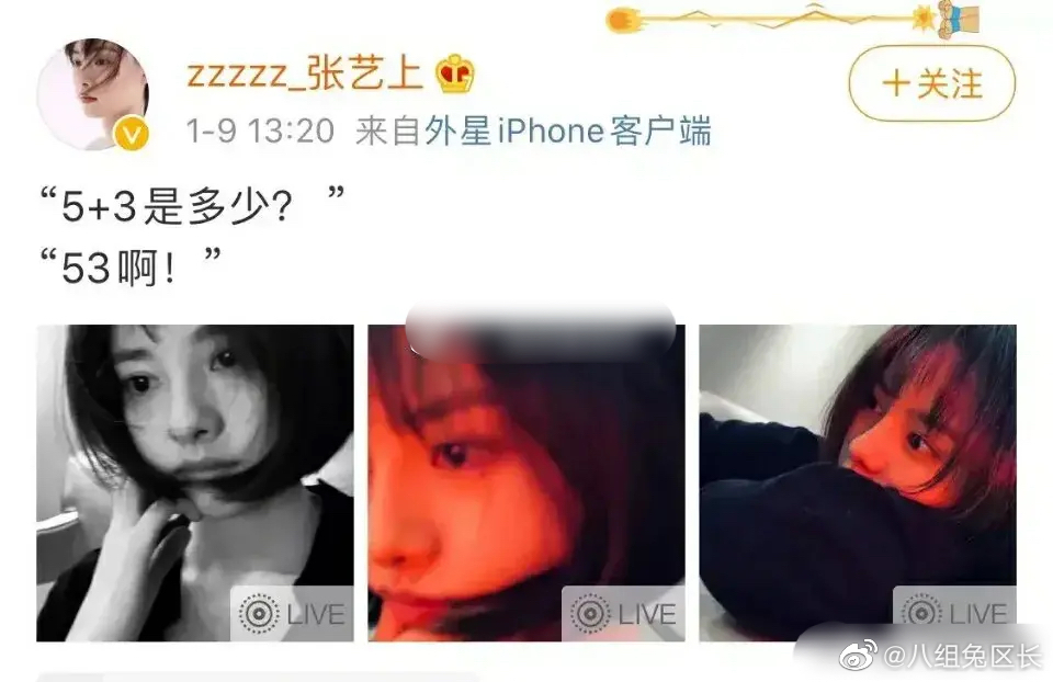 ![]() 此外,张艺上比较出名的一个事件就是跟黄景瑜谈恋爱了,当年网络传言黄景瑜的前妻王雨馨指控张艺馨是第三者插足自己跟黄景瑜,而张艺上则发微博内涵迪丽热巴插足自己和黄景瑜,微博内容是“5+3是多少?53啊”,实际5+3是多少?大家都知道是8嘛,热巴的“8”,而3是什么意思??“三”呗。 ![]() 在2021年1月11日,王雨馨也发微博内涵迪丽热巴,模仿了张艺上发微博的方式(8-5=3,巴减掉我就是三),但是不管怎么内涵,都是指向同一件事,那就是目前黄景瑜和迪丽热巴真的可能是在一起了。 ![]() 下面是黄景瑜和迪丽热巴拍戏的亲密互动动图 ![]() |