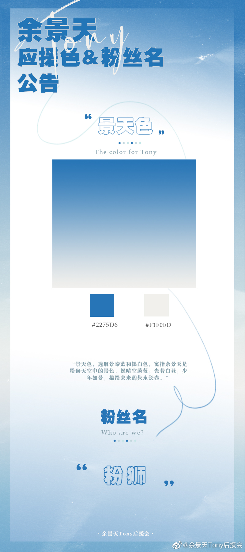 据悉余景天的应援色和粉丝名都是自己选的,余景天的应援色为景天色,景天色是蓝+白的颜色,准确点说是景泰蓝和银白色,寓指余景天是粉狮天空中的景色,愿晴空蔚蓝,光若白昼,少年如景,描绘未来的隽永长卷。