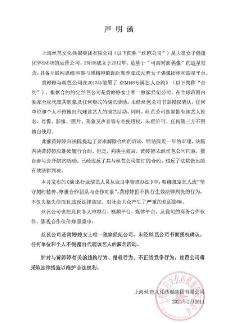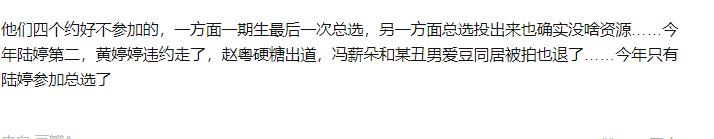 黄婷婷的名气在SNH48之后就愈来渐显露,毕竟是一位人美歌好,演技佳,多才多艺又爱笑的小姑娘,前途是肉眼可见的一片良好,但是在一段时间之后声响就有点平淡了,很多网友表示这是公司的规划问题吧,毕竟还闹出了黄婷婷单方面宣发和丝芭解约的事情,但是看着好像又没有确切落实,所以关于黄婷婷的事情,她为什么没参加第六届总决选,还有她退出SNH48了吗? 黄婷婷为什么没参加第六届总决选, 黄婷婷没有参加第六届总决赛是因为个人意愿吧,有比较了解的网友分析说是因为去年是一期生最后一次总选所以没有参加,而且那个时候黄婷婷对于自己的未来已经有别的想法了,没有必要再去参加节目了,更何况那时候说是公司的一些规则,我们外部人员都已经看在眼里了,更何况是身处其中的黄婷婷等人,所以她选择不去参加第六届总结赛也是挺能理解的。 其实对于黄婷婷的不参加第六届总决赛,很多网友粉丝是早早就能明了的,毕竟公司的所作所为粉丝都看在眼里,个中缘由大家是众说纷纭的,虽说隔着荧幕也说不上好谁对谁错,但是黄婷婷有这样的选择也无可厚非。很多粉丝表示理解,并且支持。甚至有网友对丝芭公司表示了强烈的不满。 她退出SNH48了吗? 黄婷婷还没有正式退出SNH48,她只是个人单方面的解约,公司是不认的,也就前两天,丝芭公司还在发表声明,称黄婷婷任然是丝芭旗下艺人,丝芭公司依然还是黄婷婷唯一独家经济公司,用书面合约绑定的黄婷婷,不管怎么说,只是要合约还没有解除,那么黄婷婷都还是丝芭公司名下,她都还是SNH48成员,所以根据现在的情况,黄婷婷大概率是还要留在SNH48,和丝芭公司达成和解,继续自己的SNH48团体生涯。
