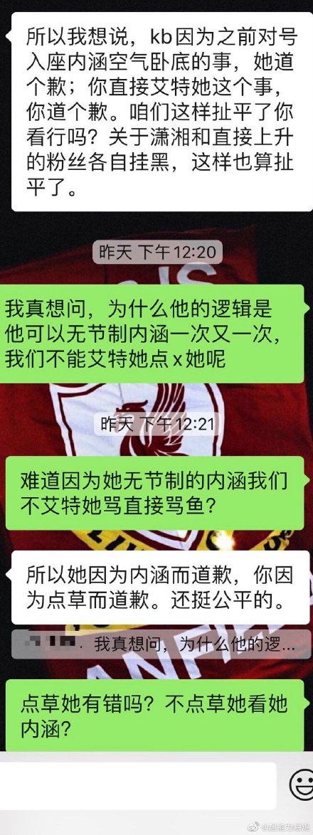![]() 当时KB内涵了孔雪儿,还为此道歉,不过KB也要求孔雪儿的粉丝为其道歉,因为KB人为自己被挂出来了,这个行为不好,下面是当时的聊天记录 ![]() |