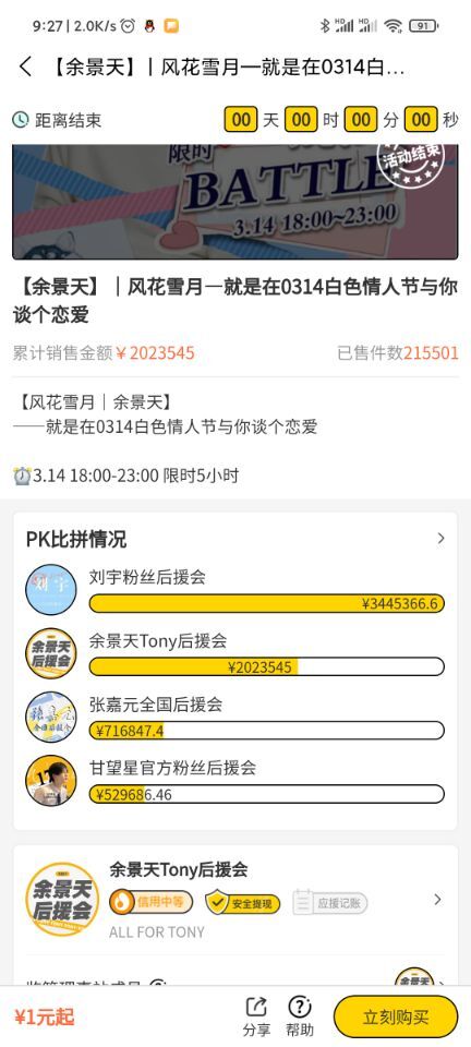 ![]() 比如,这次桃叭崩了的主要原因就是大量粉丝为刘宇(创造营2021选手)和余景天(青春有你3)选手进行捐助,下面是桃叭APP上的应援现场,粉丝们真是太疯狂了,刘宇收到了300多万的应援经费,而余景天是200多万。 ![]() 这种经费比拼也叫“battle”,想看“battle”的结果需要在“battle广场”(也有人叫“battle小助手”)里面查看,具体在“经费”--顶部的“battle广场”里面查看,如下图: ![]() |