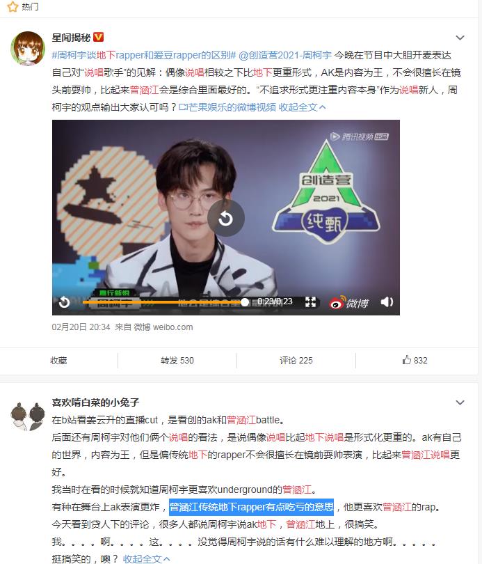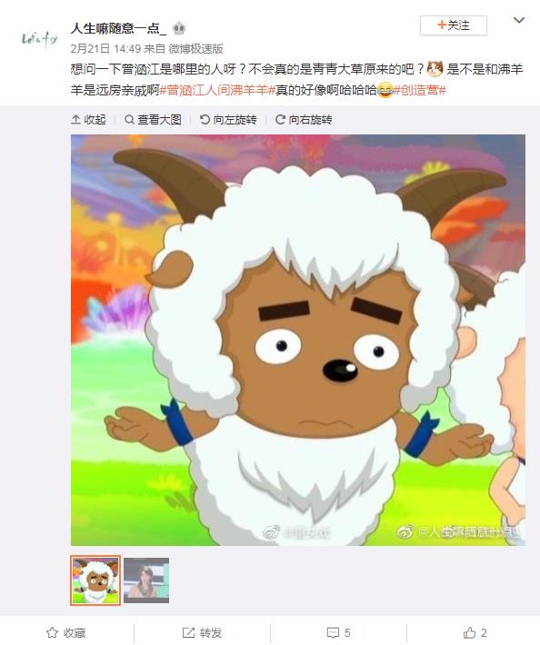 ![]() 曾涵江是说唱歌手出身,2000年5月23日出生出生,今年21岁,四川成都人,高中就读于四川成都温江中学,身高180CM,因为曾涵江的造型跟沸羊羊非常的“神似”,所以大家也喜欢叫他沸羊羊。 ![]() 在节目上,周柯宇曾经对曾涵江有一个评价,还谈到了爱豆说唱歌手和地下说唱歌手的区别,并谈到曾涵江作为地下说唱歌手,是综合条件最好的,通过这个表述来看,曾涵江曾经是地下说唱歌歌手。 ![]() |