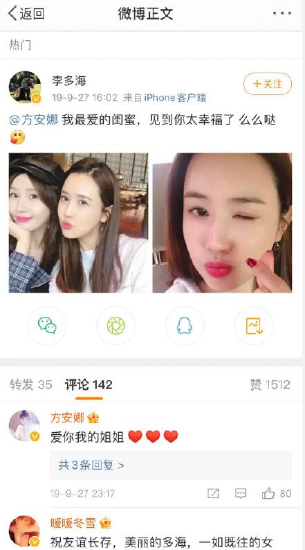 据悉,方安娜和杨幂、李多海、李小璐、马苏都是闺蜜关系,平时在微博中互动频繁,能看出关系很不错。