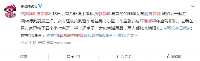近日,李易峰和方安娜配拍到一起在酒店过夜,还拍到女方去了男方小区,并再男方家里待了4小时才走,疑似恋情曝光,但李易峰工作室很快做出反应否认恋情,说二人在圈内众所周知的好友,非情侣关系。