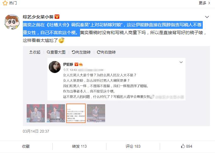 最近范志毅吐槽男篮周琦和郭艾伦上了热搜,王仕鹏表示“国足什么时候可以评价男篮了”,对此有网友表示“娱乐节目当真就是输了,比赛不当真就输了”,一语中的!其实早就有人反应《吐槽大会》其实是有稿子的,并不是现场吐槽、选手的临场发挥,而是有专门的写手写出来的。上一次黄奕在吐槽大会上调侃秦昊“上对花轿嫁对娘”,对此伊能静就表示非常的不满,表示写稿人不尊重女性,这时不少网友猜幡然醒悟,原来不是临场吐槽啊!!!